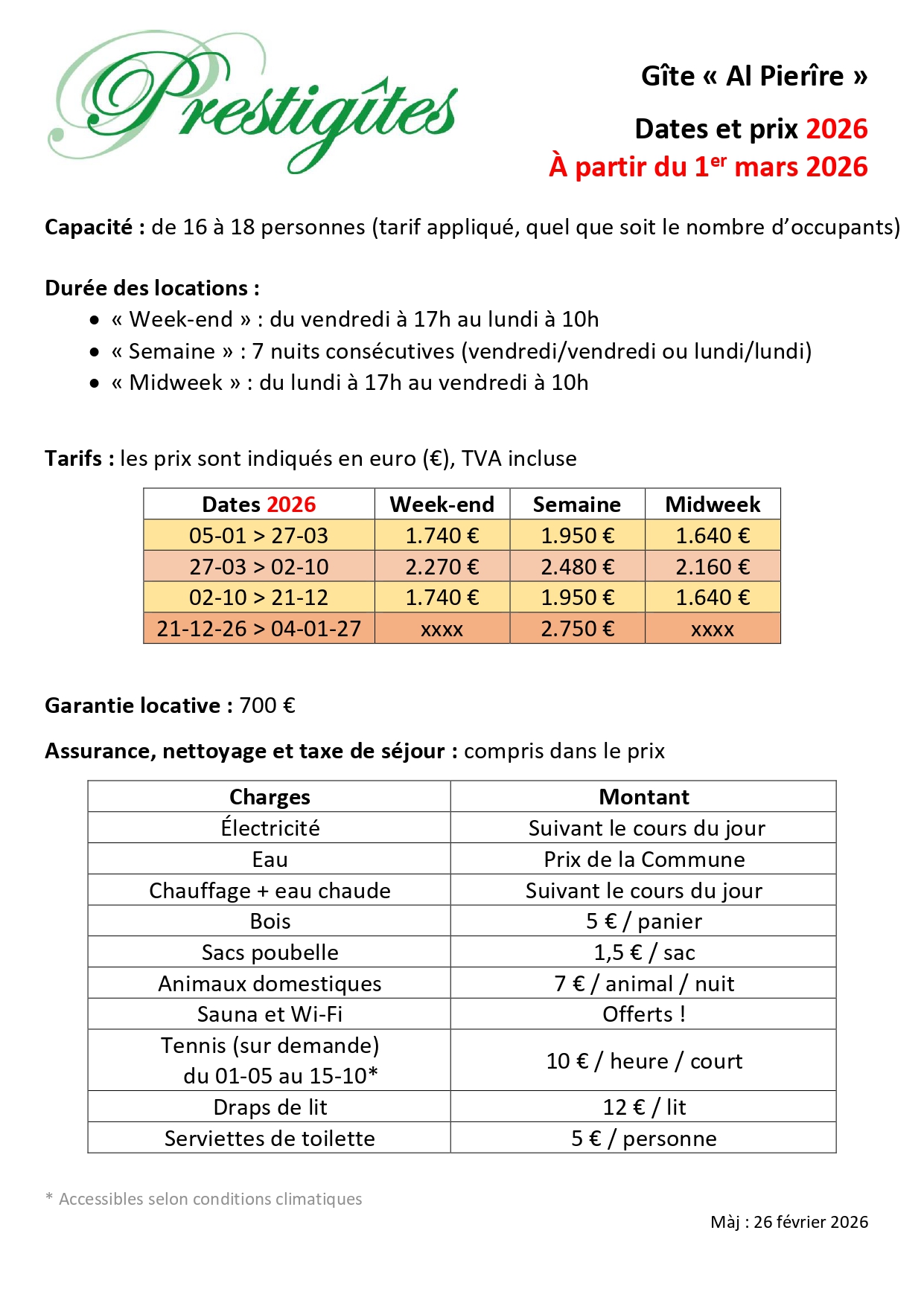 Vous trouvez ci-dessus les prix pour la location du gîte Al Pierîre. Pour une location spéciale, une option ou une question, n’hésitez pas à prendre contact avec nous !